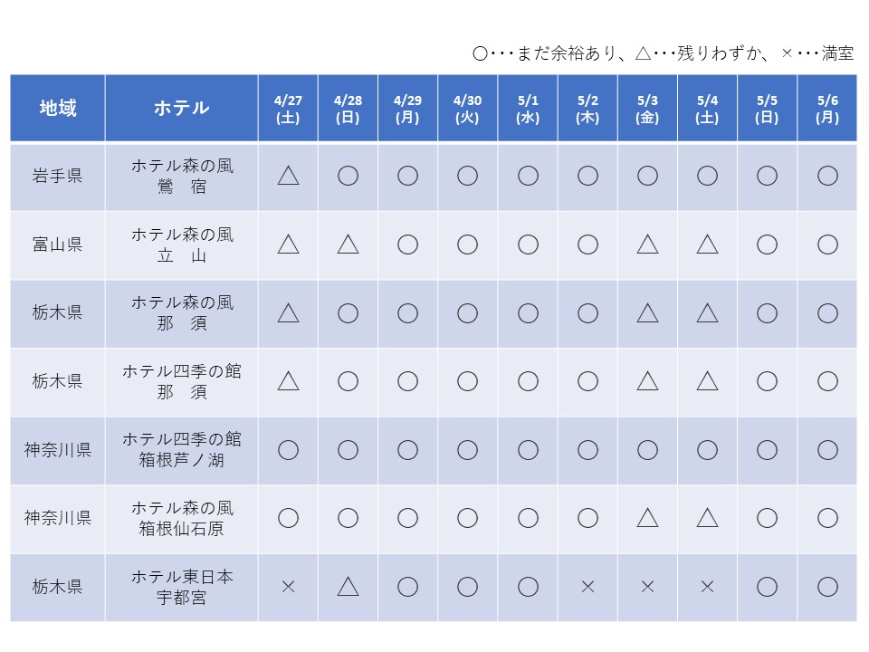 日本ハウス・ホテル&リゾート 全グループのゴールデンウィーク期間(4/27~5/6) の空室状況をお知らせ致します。